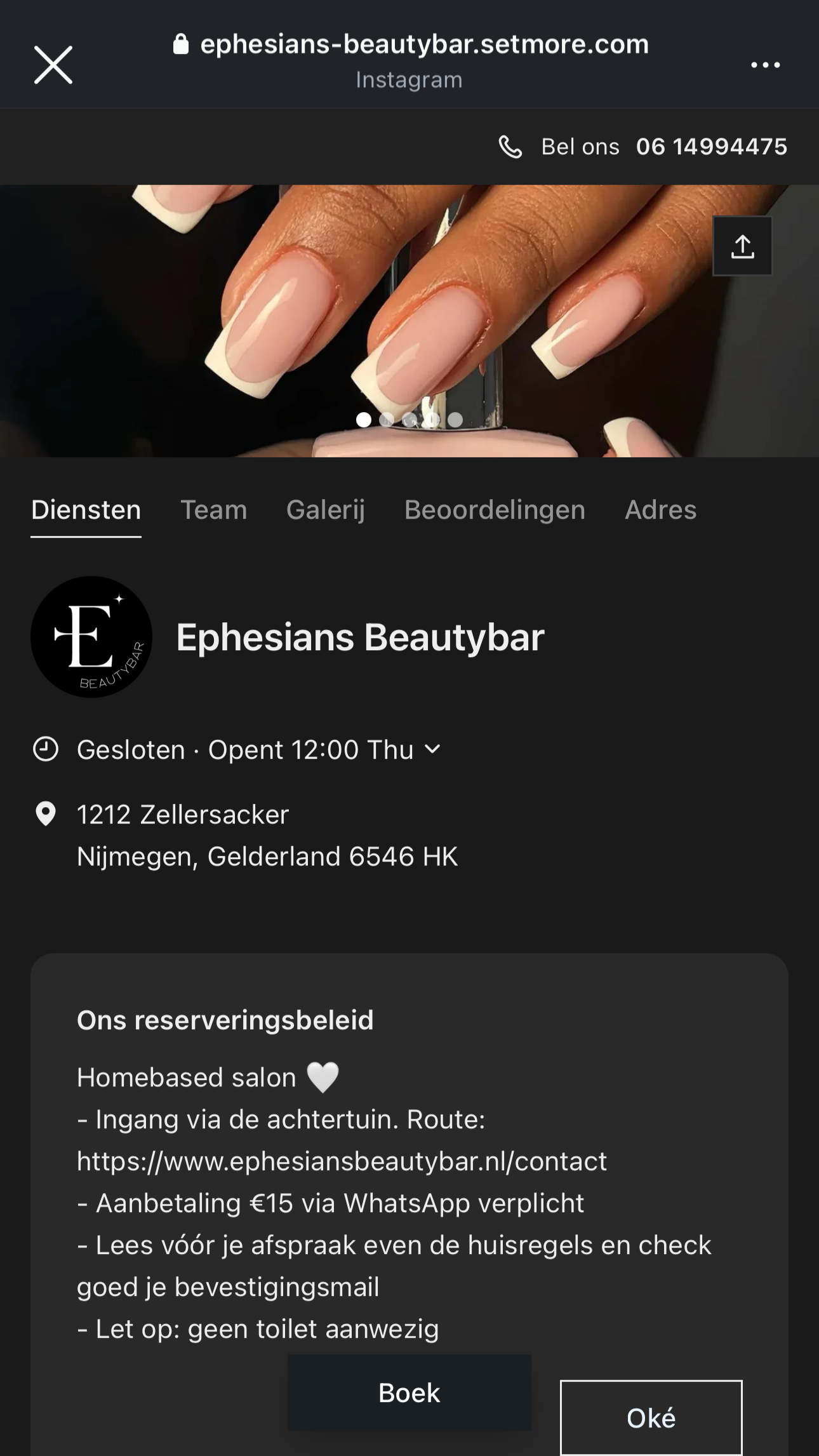 Binnen 24 uur na het boeken, ontvang je via WhatsApp een betaalverzoek van €15 voor de aanbetaling. Pas na de aanbetaling is de afspraak bevestigd.